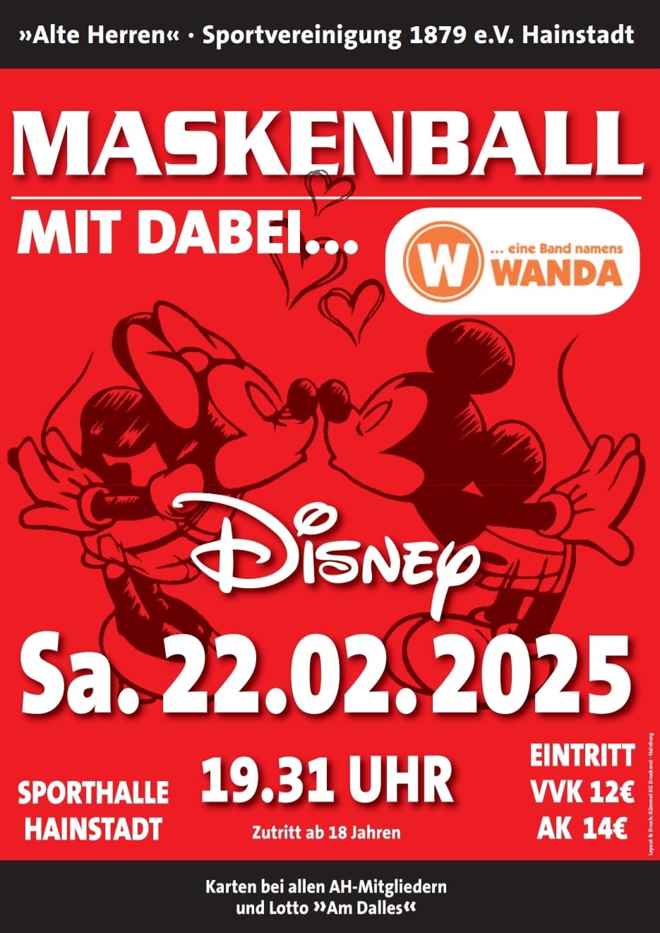 Unter dem Motto Disney laden wir dich ein, in die zauberhafte Welt deiner Lieblingscharaktere einzutauchen. Ob Prinzessin, Bösewicht oder Held – lass deiner Fantasie freien Lauf! Für die perfekte Fastnachtsstimmung sorgt die gefeierte Band namens Wanda, die mit den besten Party Hits den Abend unvergesslich machen wird. Sei dabei, wenn Märchen auf mitreißende Musik treffen, und feiere mit uns einen Abend voller Glanz, Spaß und Magie.